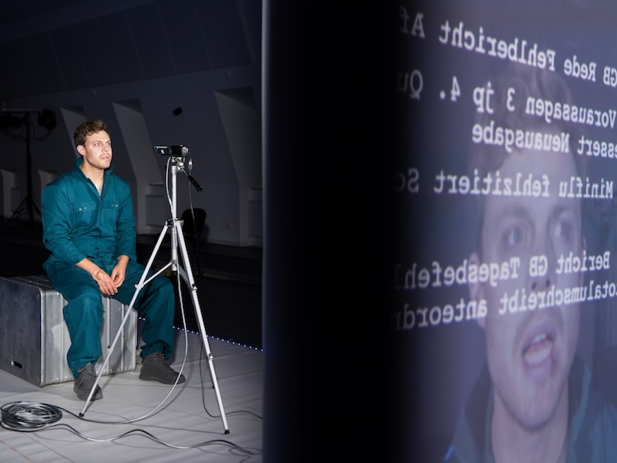 Mit dem schmalen Steg und den beiden Videoleinwandbarrikaden hat Bühnenbildnerin Sonja Elena Schröder auch den idealen Raum für die Gedanken- und Erinnerungsodyssee eines Sinnsuchers geschaffen, der auch mit seinen Selbstzweifeln kämpft und sich dabei beobachtet. Als Chronist dieses totalitären Überwachungsstaates begegnet Dominik Müller seinem Spiegelbild auf der Leinwand, wie sein Winston Smith argumentiert, analysiert und oft nicht weiterweiß, um dann selbst zur Kamera zu greifen und sich einer Nahaufnahme zu stellen. Die fragt, wer bin ich wirklich und wer kann ich überhaupt noch sein, wenn mir das Denken und Fühlen verboten wird.