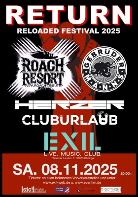 Vier Bands, volle Lautstärke, null Kompromisse: Das RETURN RELOADED FESTIVAL 2025 im EXIL bringt Nu Metal, Crossover und Indie-Pop auf eine Bühne – mit Roach Resort, Herzer, Gebrüder Manns und Cluburlaub.
