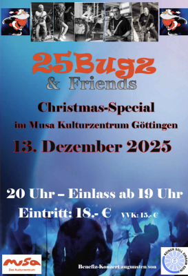 Mit dem Christmas-Special unter dem Motto 25 Bugz & Friends setzt die Band ihre langjährige Konzerttradition fort, die einst im Marshall-Museum bei Friedland begann und seit einigen Jahren in neuer Form weiterlebt. Der große Saal der Musa erwies sich bereits mehrfach als idealer Rahmen für ein Programm, das Rockklassiker, neue Arrangements und überraschende Gastauftritte verbindet.