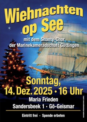 Mit »Wiehnachten op See« führt der Shanty-Chor der Marinekameradschaft Göttingen ein Programm auf, das traditionelle Weihnachtslieder mit der Atmosphäre norddeutscher Seefahrertradition verbindet. Der Chor, der seit fünf Jahrzehnten besteht, gestaltet seit 2014 regelmäßig weihnachtliche Konzerte und hat dabei ein Repertoire entwickelt, das zwischen klassischem Chorsatz und maritimem Klangbild vermittelt. Die Mischung aus bekannten Melodien, plattdeutschen Texten und seefahrerischer Klangfarbe verleiht dem Konzert eine besondere Note. Charakteristisch sind der warme Chorklang, die klaren Männerstimmen und eine Gestaltung, die sowohl festlich als auch erdverbunden wirkt. Das Programm orientiert sich an weihnachtlichen Themen, greift aber immer wieder Motive aus der maritimen Tradition auf und schafft so eine stimmige Verbindung zwischen Küste, Advent und Chormusik.